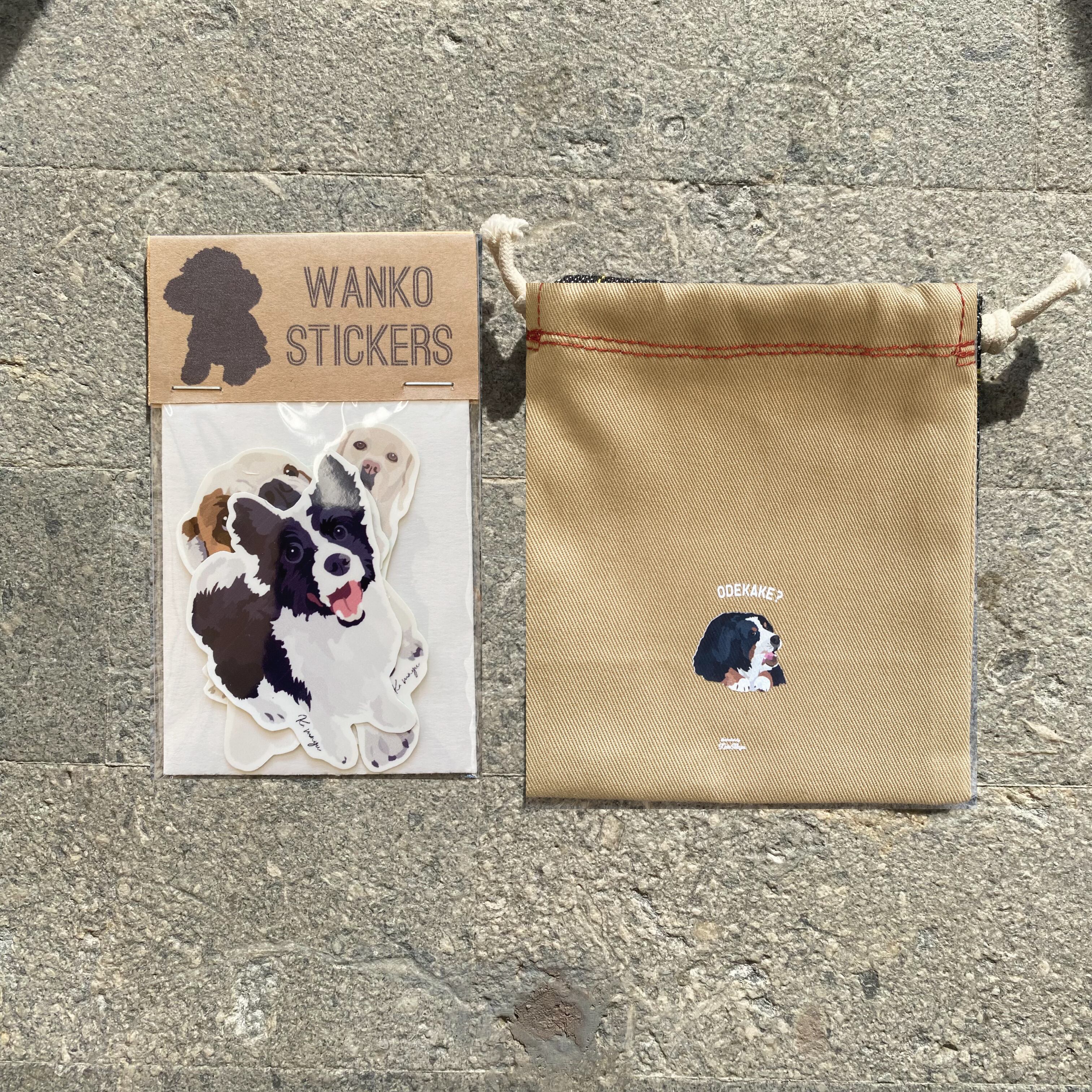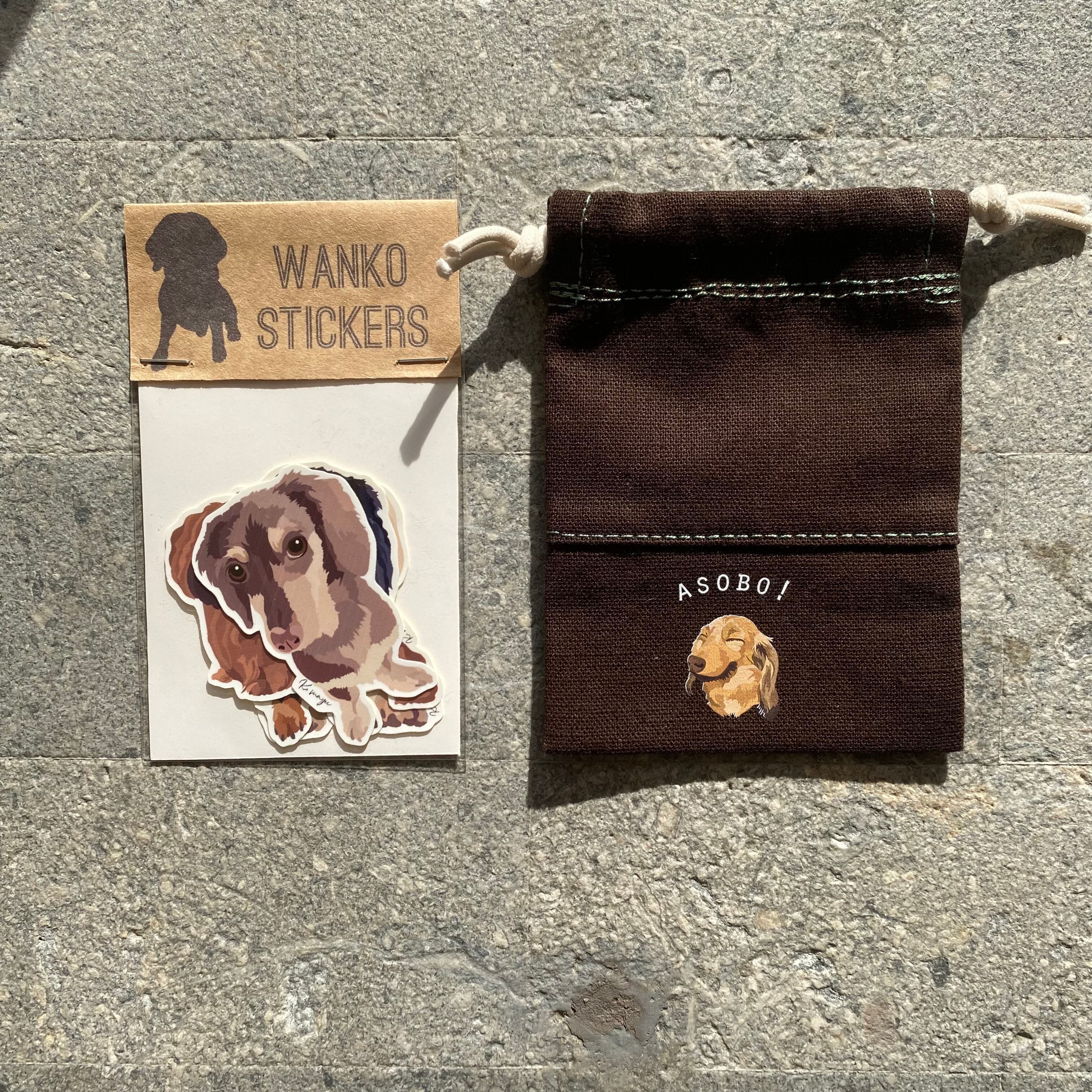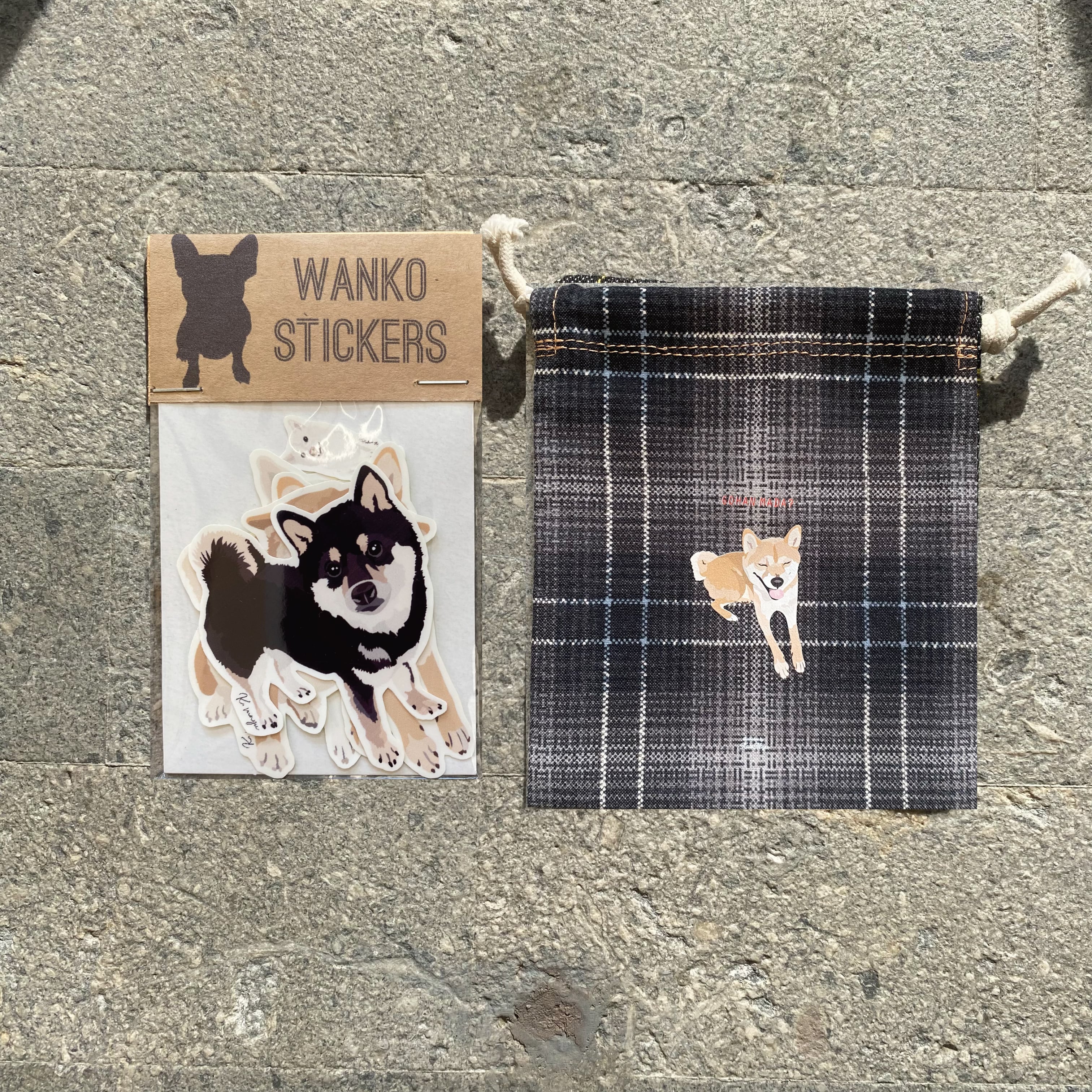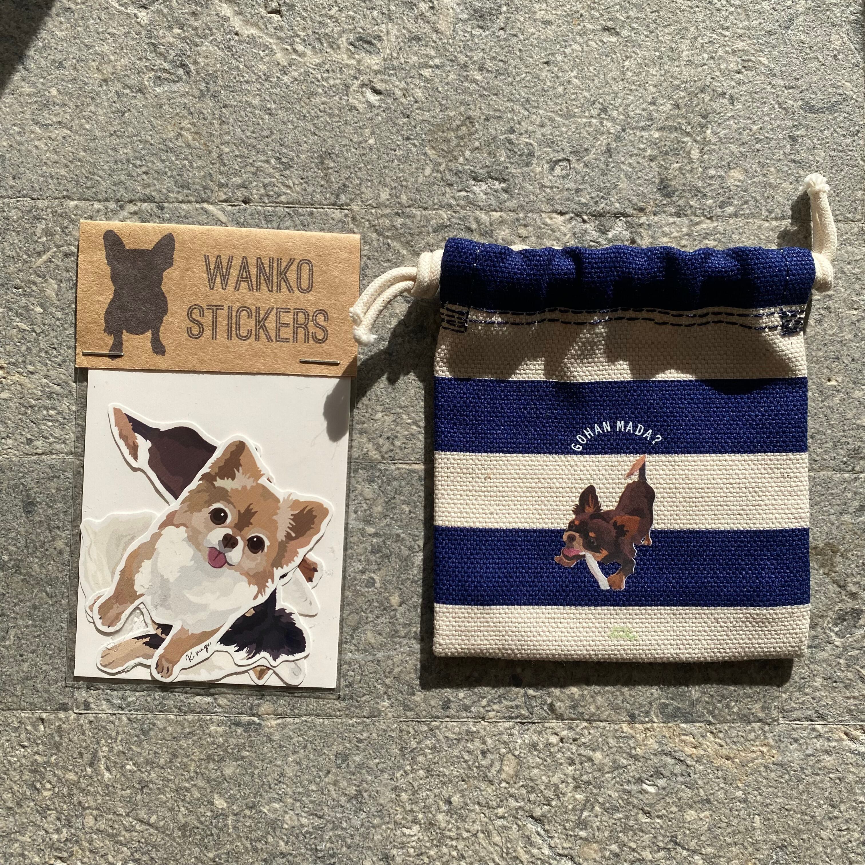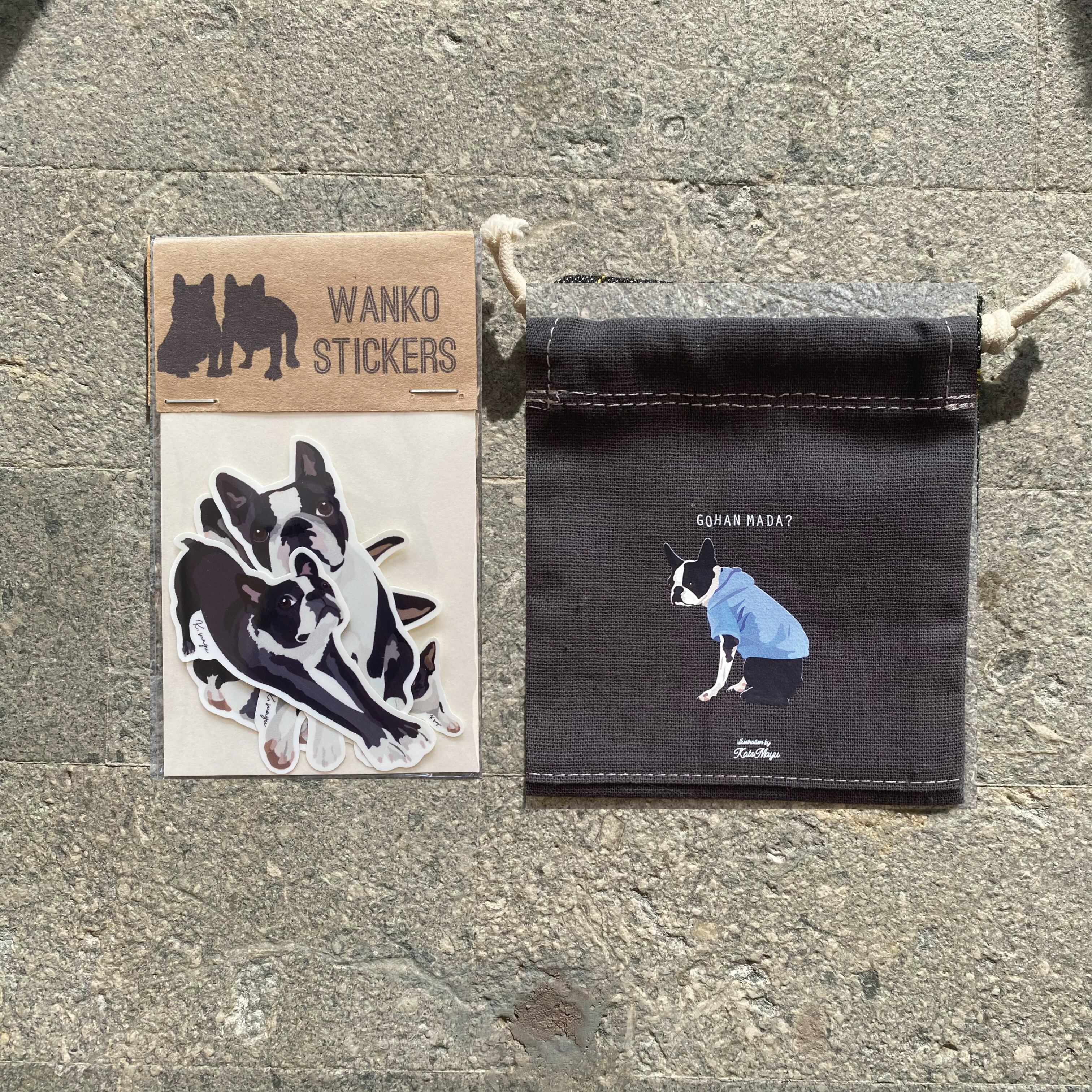 人気商品のオリジナルイラスト耐水ステッカーとミニ巾着のセットです。