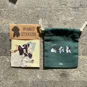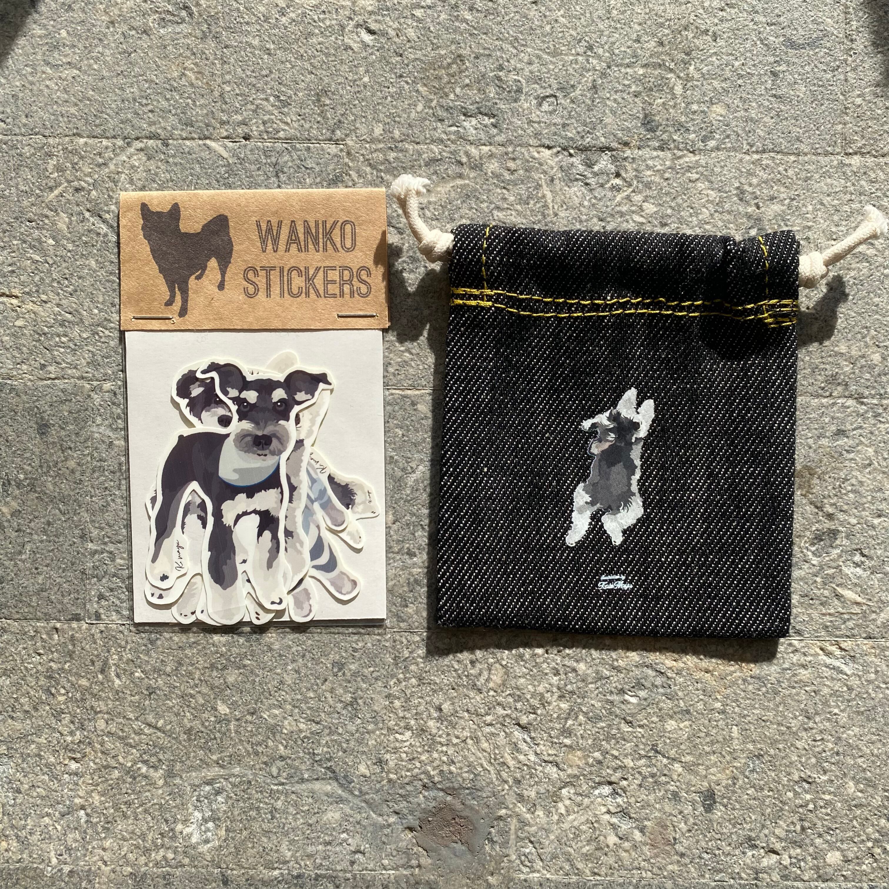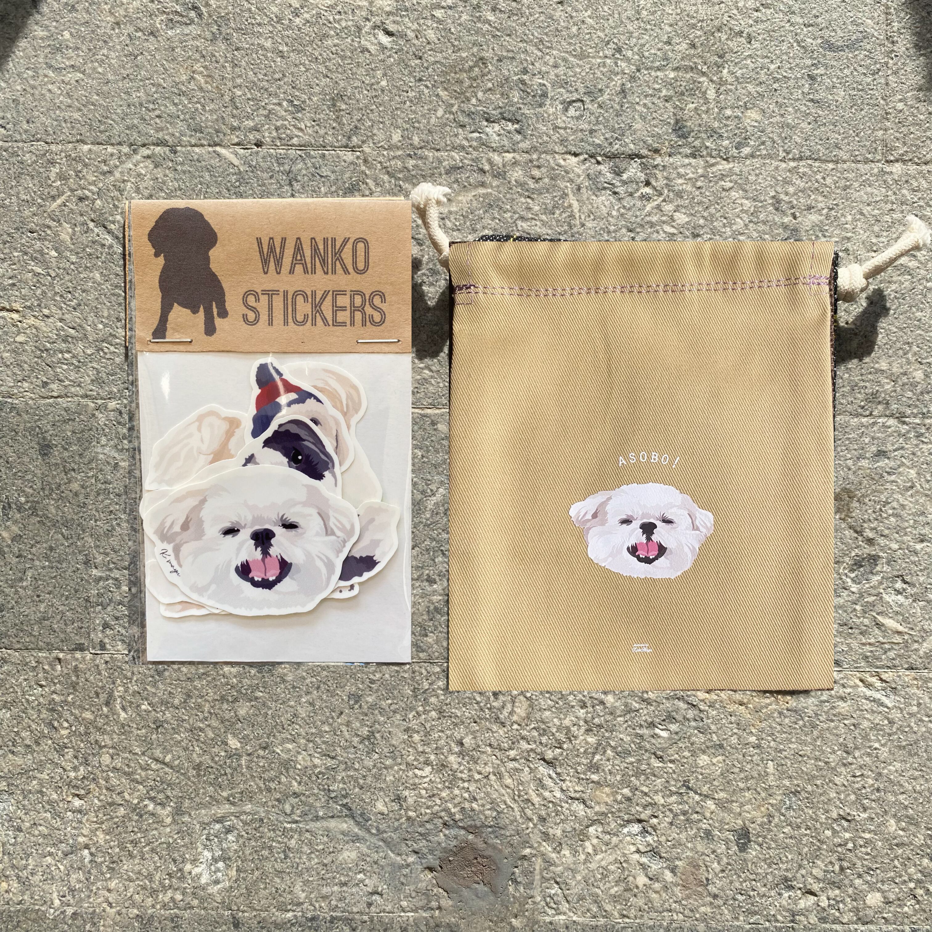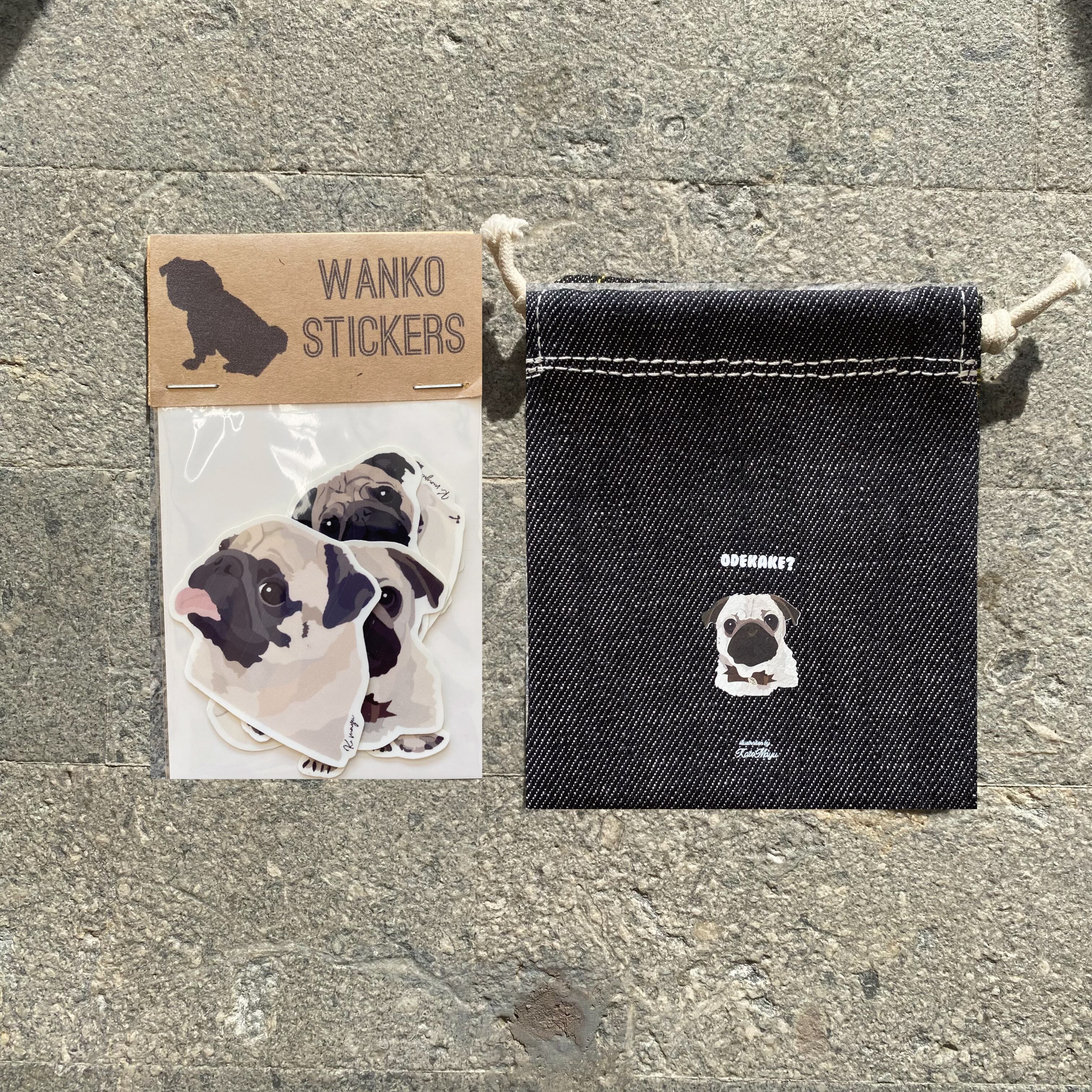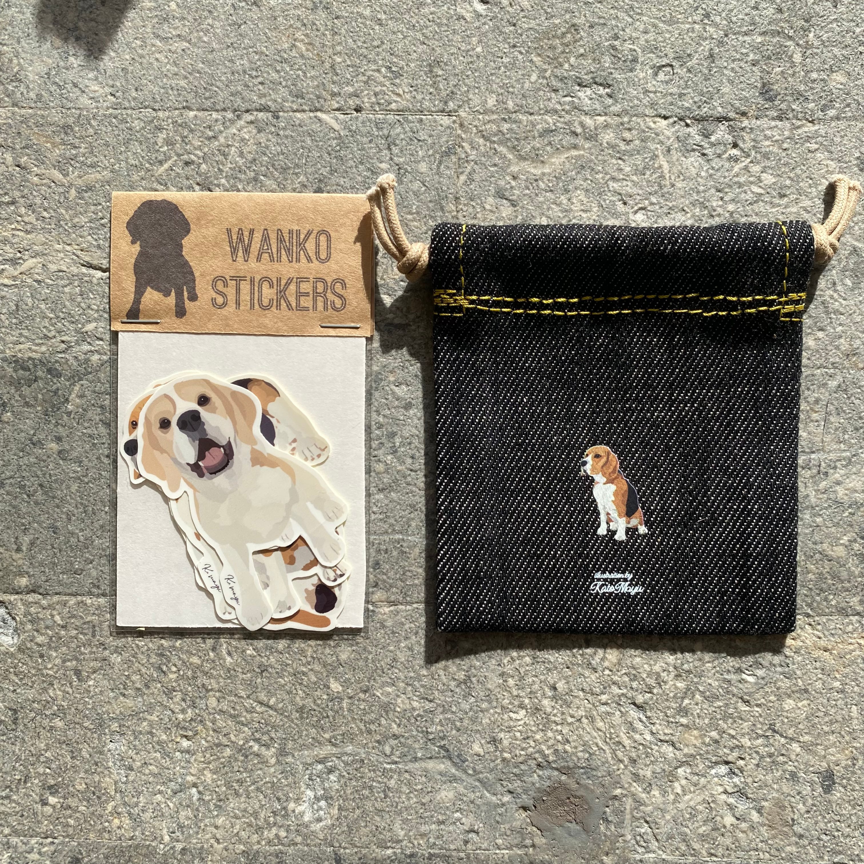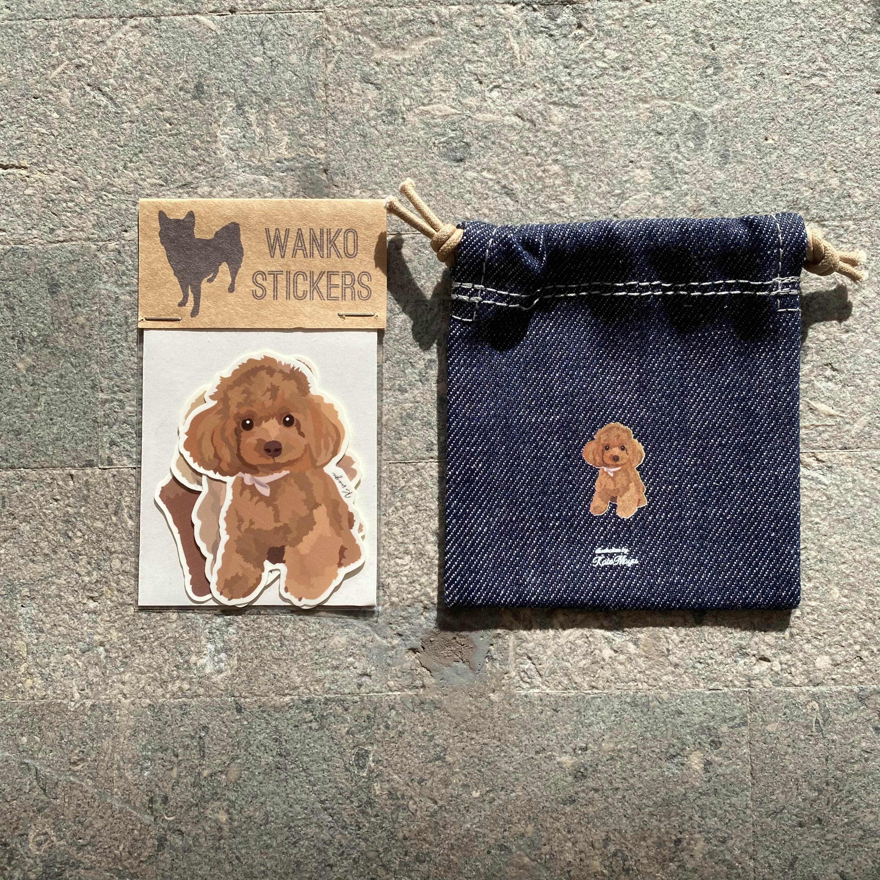 人気商品のオリジナルイラスト耐水ステッカーとミニ巾着のセットです。